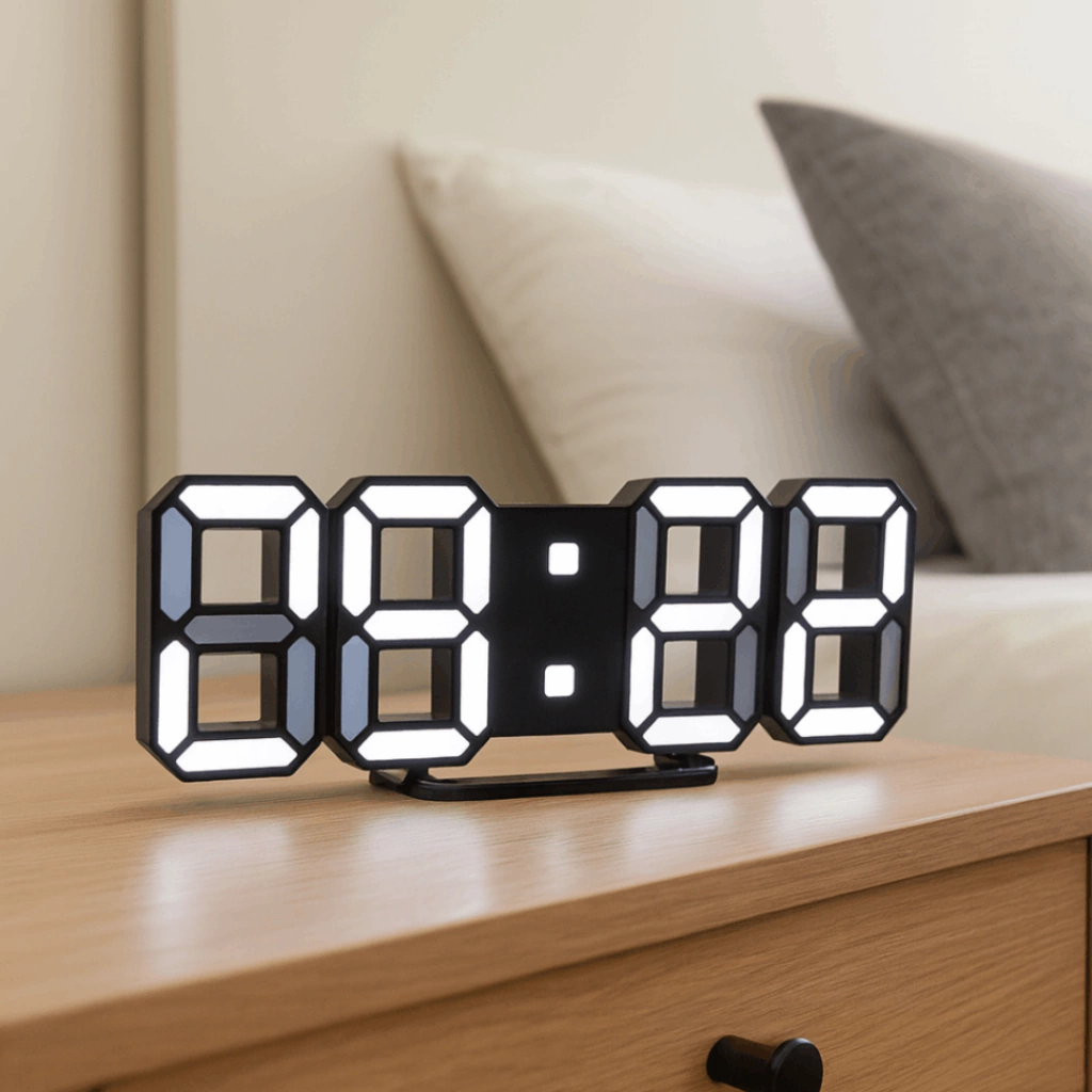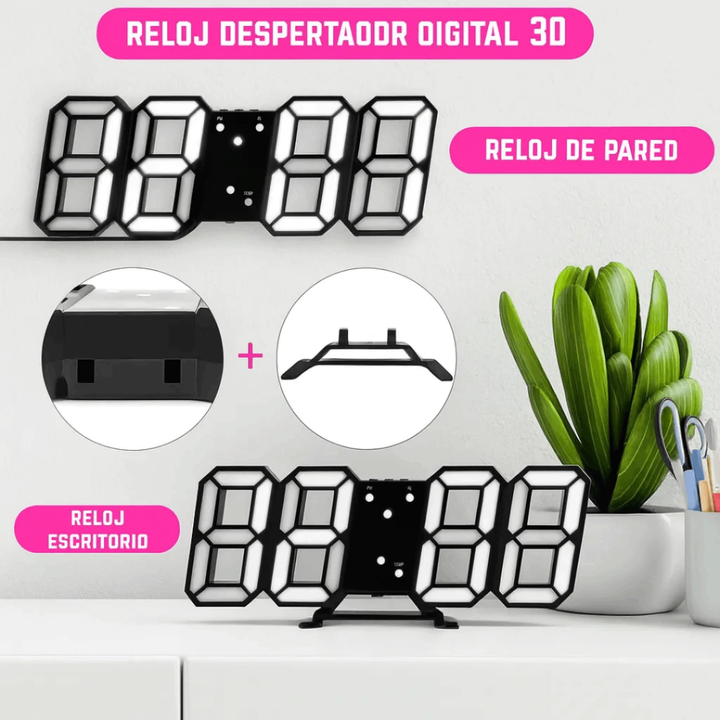 ¡Haz tu vida más simple y elegante! Despierta con estilo y precisión teniendo este reloj 3D digital como pieza central de espacio.
